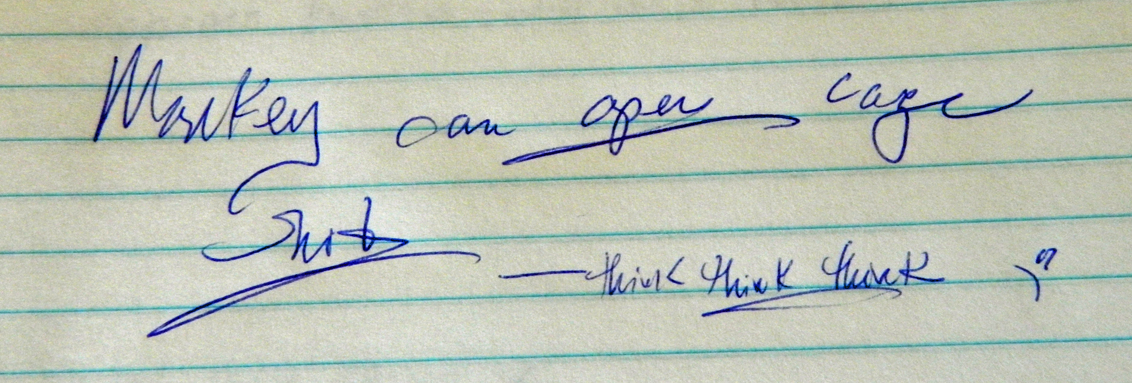 At this point Bethany led me to the stairs to the basement. She pointed out the key to the lock, hanging on a small nail near the basement door. She is almost shaking with nerves, but I am calm. Bethany snaps on the lights, and we go down the stairs. I see, a monkey cage with the door hanging wide open. The padlock is found across the floor as if it has been flung by an angry monkey ghost. At this point, I try to appear calm by writing a few quick notes.