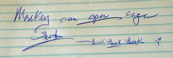 Kiley agrees the cage should stay locked if I keep the key. Kiley also insists I don’t ever tell anyone the story of my investigation of Monkey Ghost House. As I am leaving she shakes my hand, and privately says to me “I want to keep the ghost around, just until after I graduate. I really thought Bethany would keep her mouth shut.”