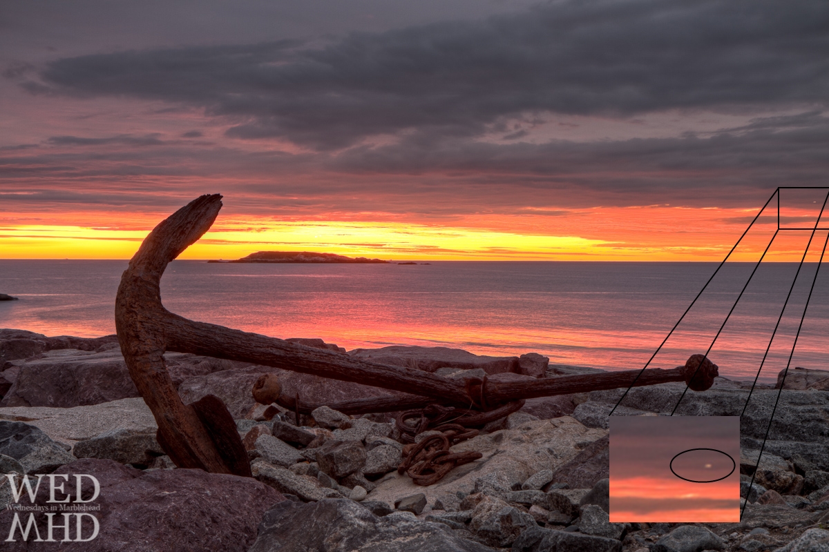 On October 26, 2011, just before sunrise, photographer Eyal Oren, hoping to capture the unusual sky condition of that morning, took a series of shots of an old anchor on a beach in Marblehead, Massachusetts. (See Image 1) While processing the photographs, he noticed a small bright spot near the right edge that moved from one photo to the next. After posting the still on his photo blog, he cropped the sections of the series containing the light, and posted a short animation of the object and described the incident in his blog.   An online publication specializing in local news reported the story about the mysterious object over Massachusetts Bay. Subsequently, several UFO and local websites including WCVB-TV picked up on the story. Image