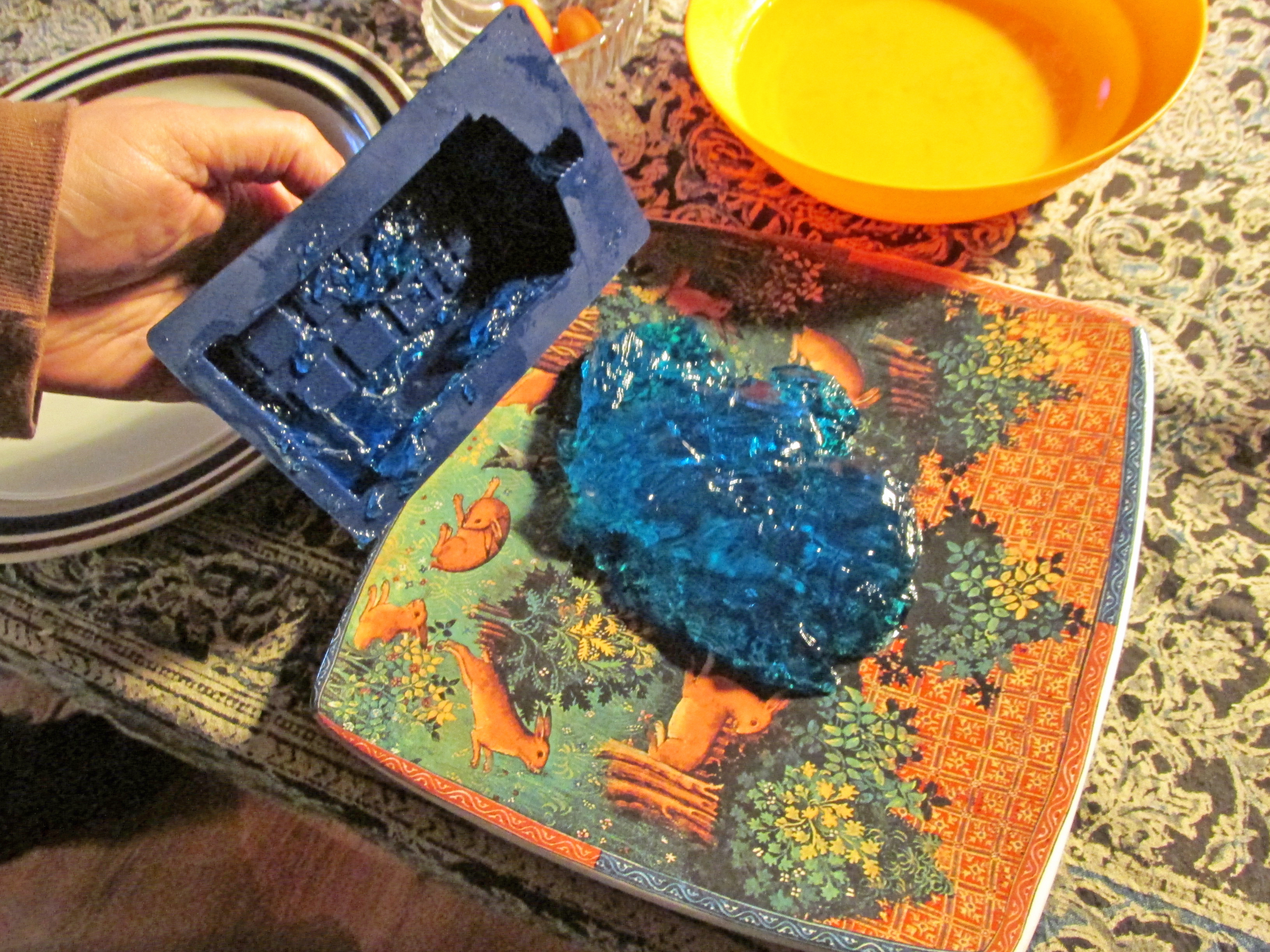 Ever hopeful, we let it defrost. Our plan was also to have the tardis land on some mysterious Medieval setting, so we picked a plate to reflect a new adventure! No boring landing spot for our jello tardis.