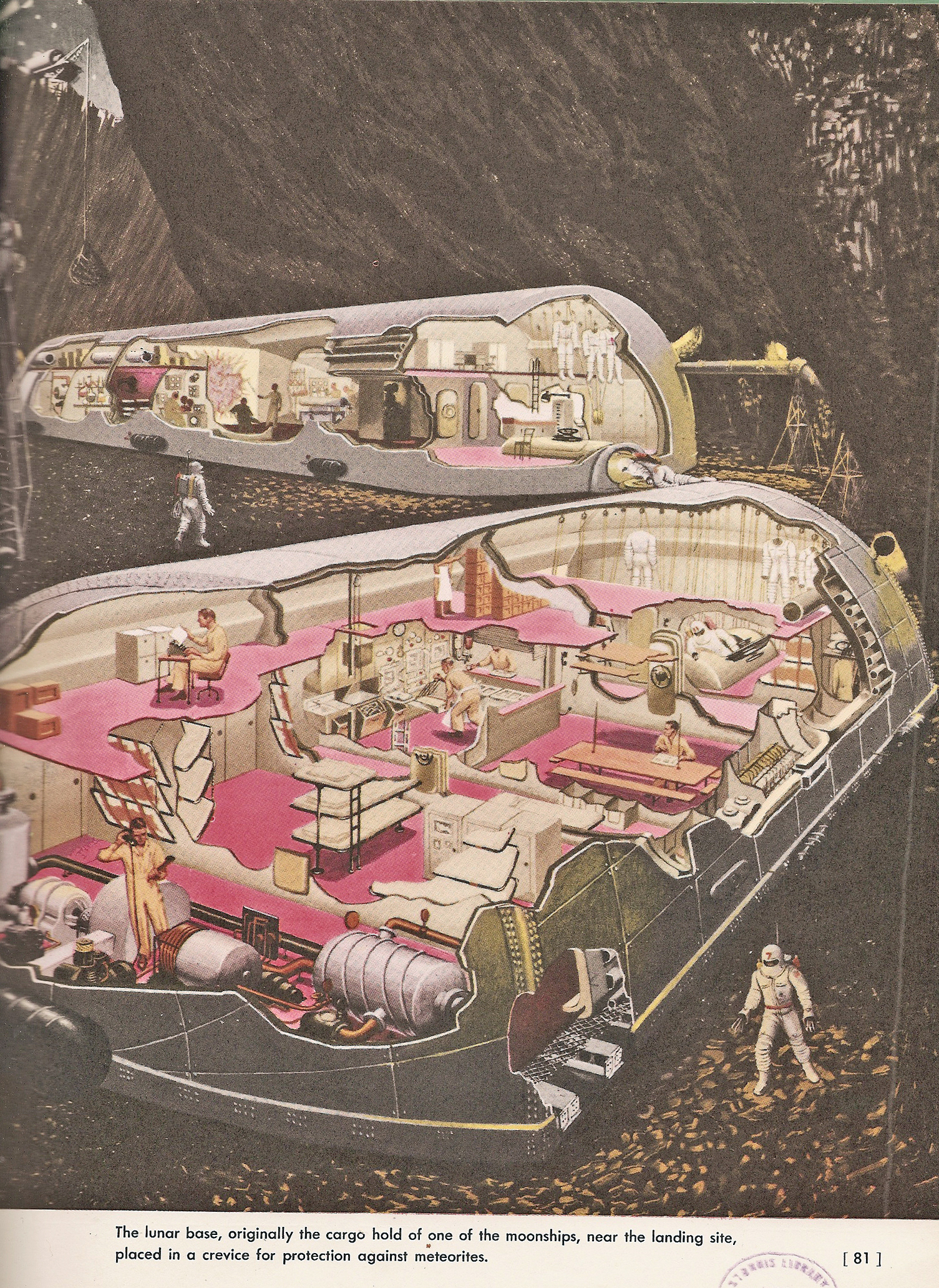 The local used book store, Homestead books in Marlborough NH, has an incredible selection of vintage science books.  I picked up a copy of “The Conquest of the Moon” by Wherner von Braun, Fred L. Whipple, Willy Ley and edited by Cornelius Ryan.  This 1953 book is filled with details about how the United States will not only travel to the moon, but also colonize it.