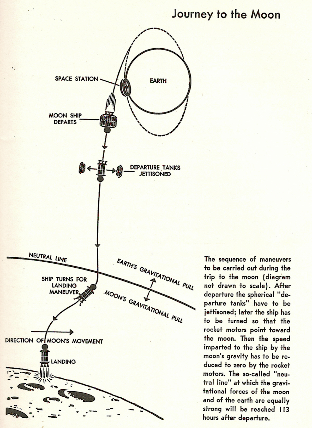 “This volume tells how we will make the trip to the moon, what we will do when we get there, and how we will return.  how soon could such a pioneer expedition set out?  Perhaps within twenty-five years-certainly by the end of this century.