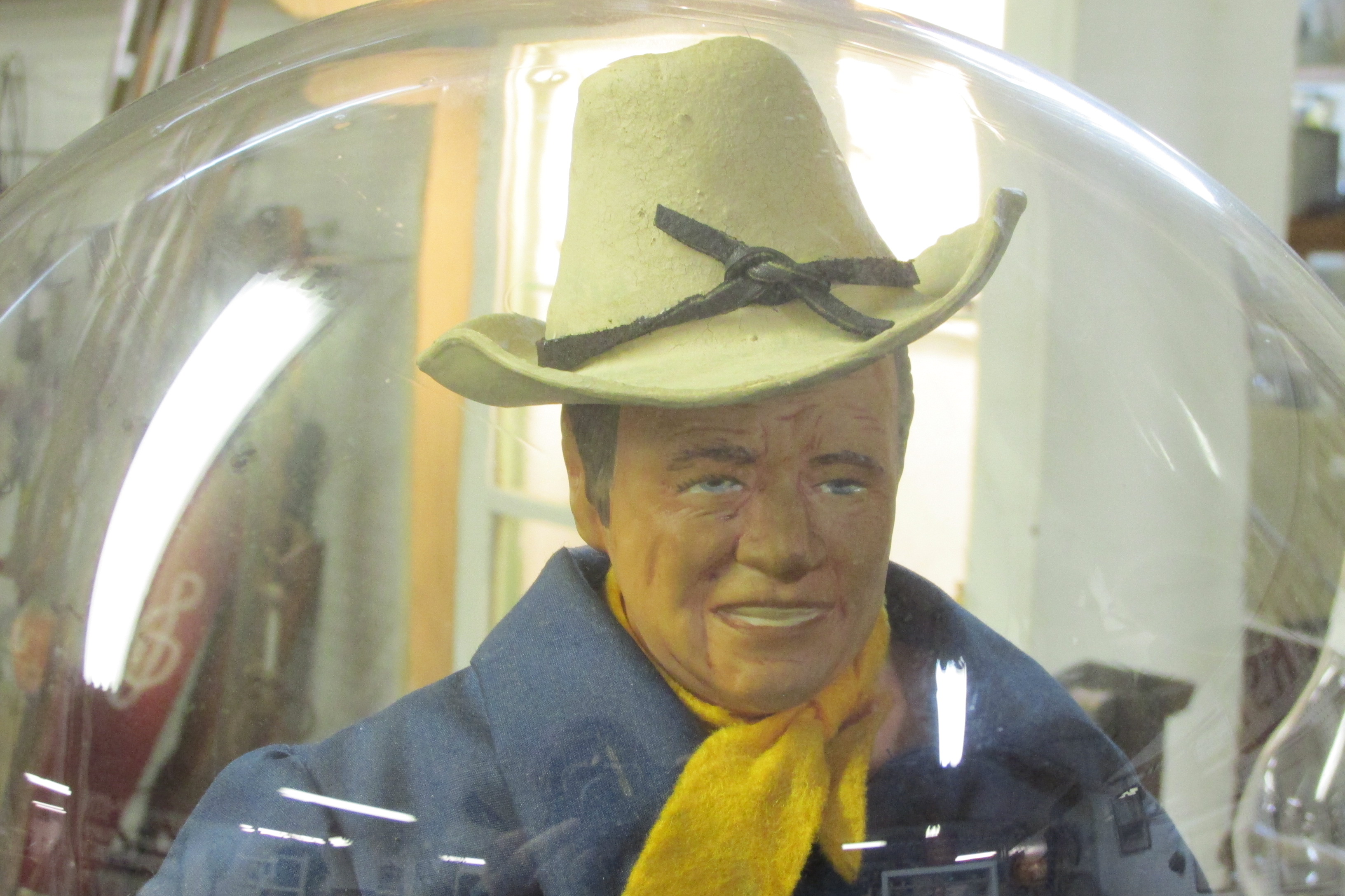Well, who hasn’t wanted a beautiful work of sculpture such as this statue of…I’m not sure. I think it could possibly be John Wayne, looking at his face, perhaps after he had been embalmed. Still, this cowboy comes with a protective glass covering just because he’s so special. Insist this gift goes in the living room, see if it will fit on the fireplace mantle.