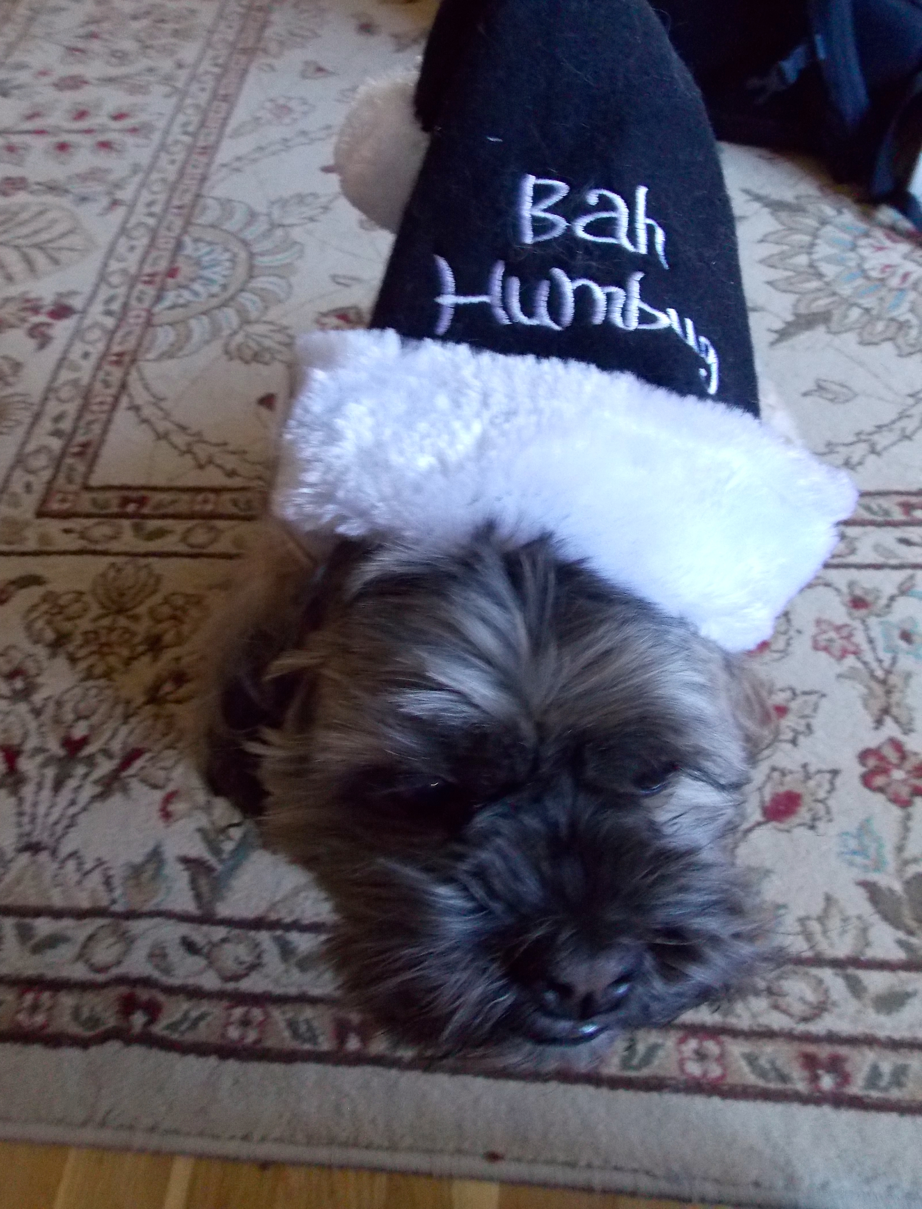Dingo wears the non Santa hat, but he’s really happy his grandfather Lamont sent STEAKS for holiday dinner!
