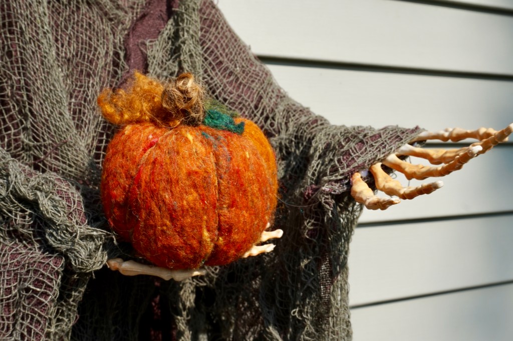 First off, if you use wool yarn, you can just felt the yarn into the pumpkins creases. No need for a needle and pushing it through all that pumpkin. Just felt it in place as you make the crease. It works quite well.