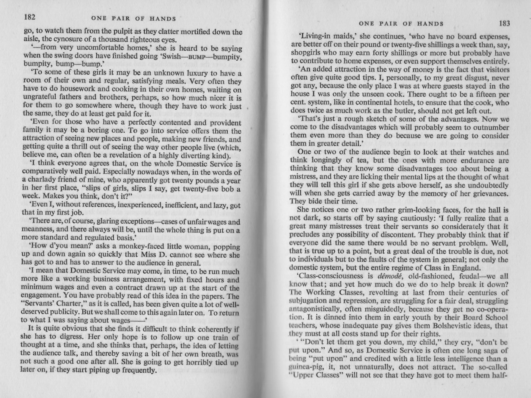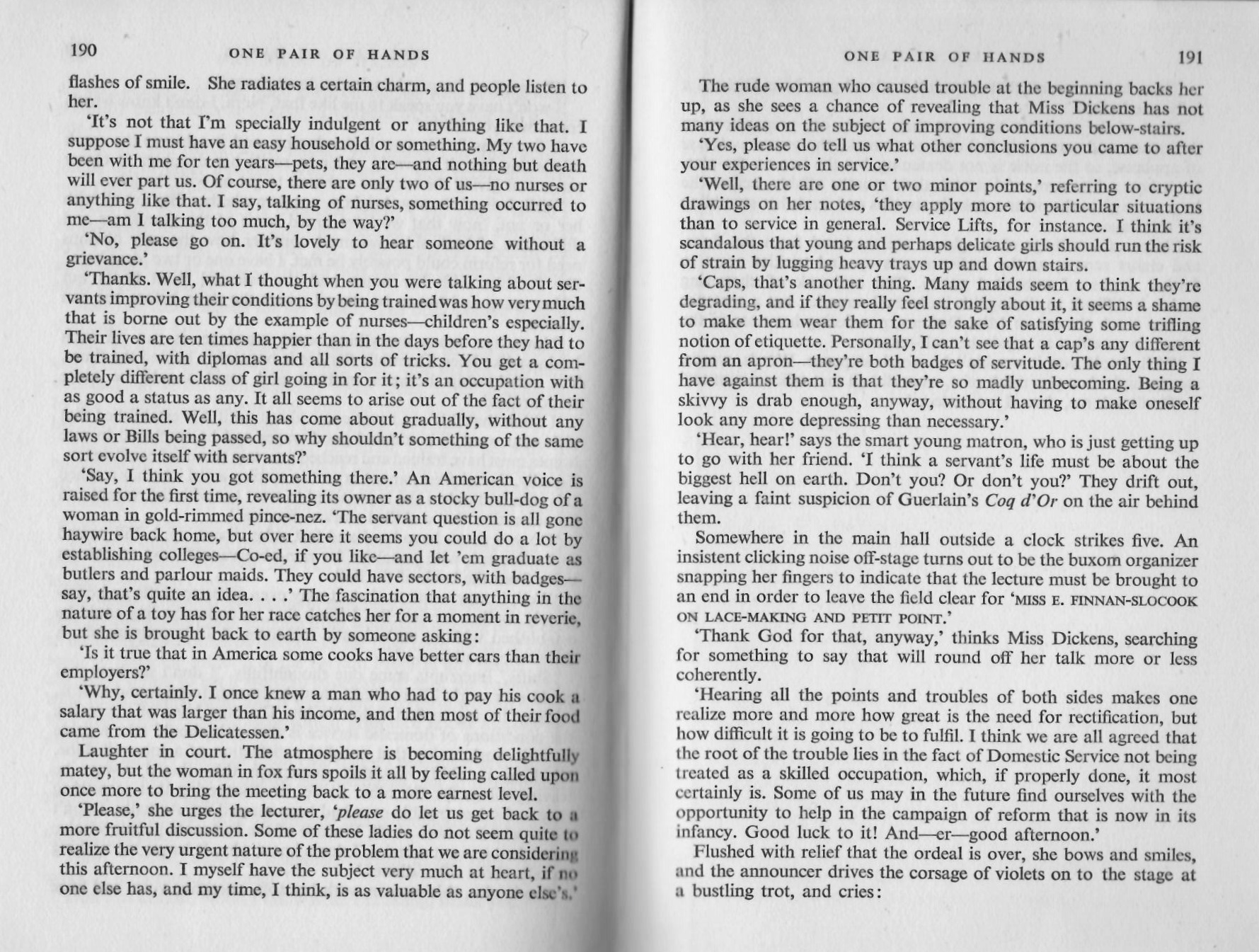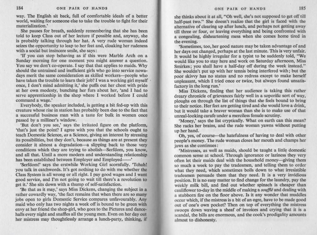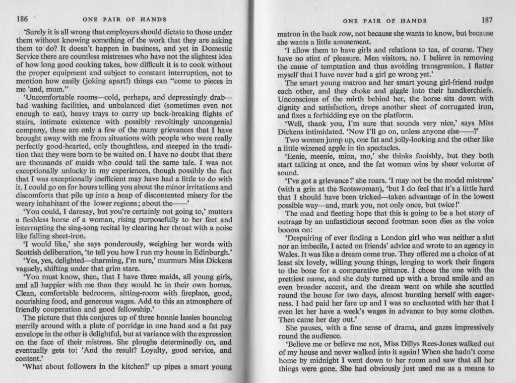 That last chapter helped to sum up how people felt about servants, since most of the book has been about Monica Dickens “impersonation” of a servant this chapter gives a glimpse into the employers complaints.